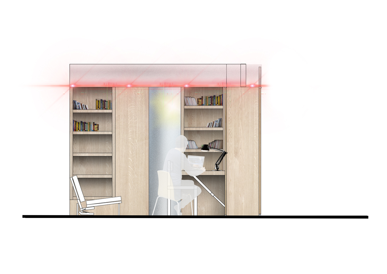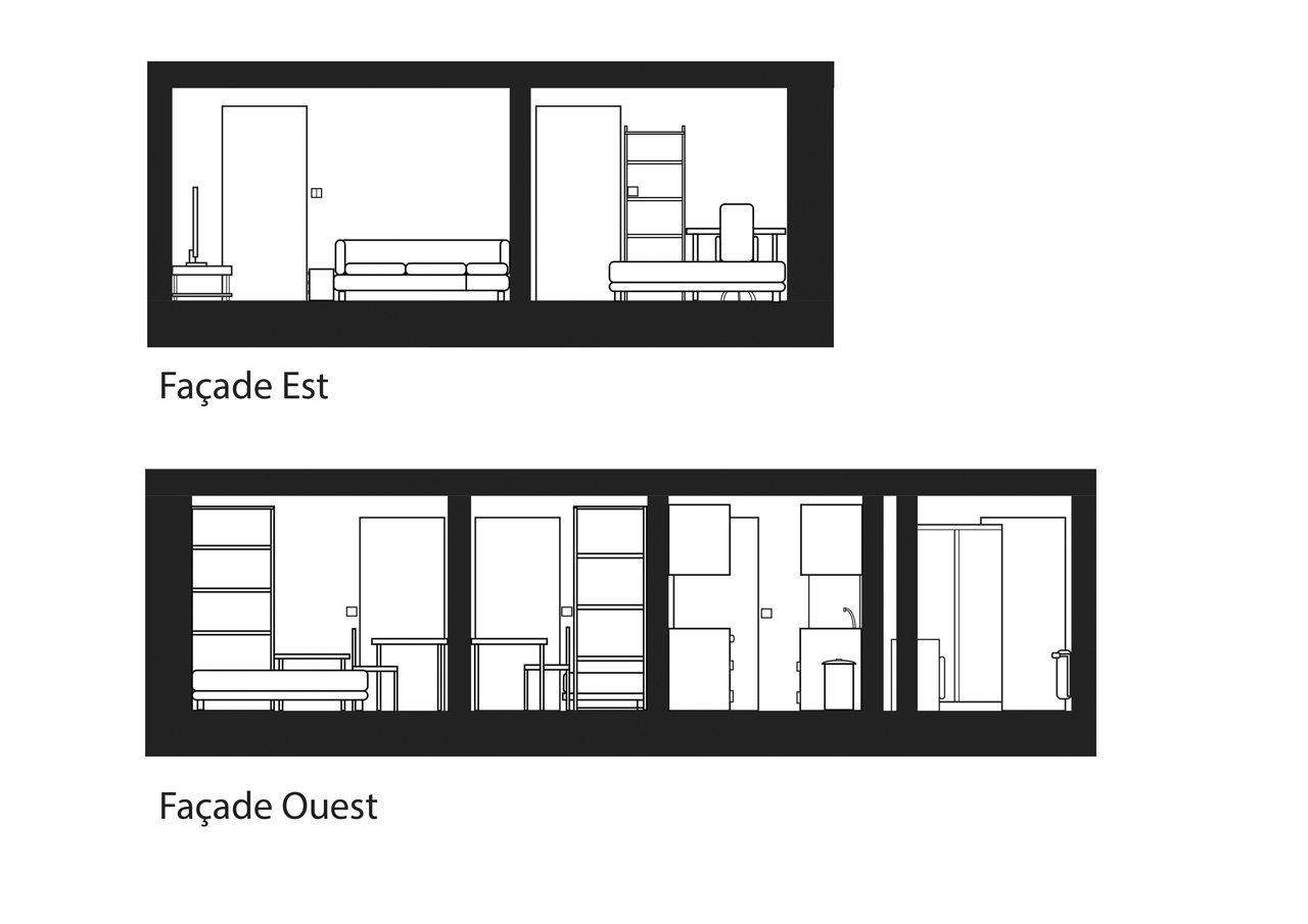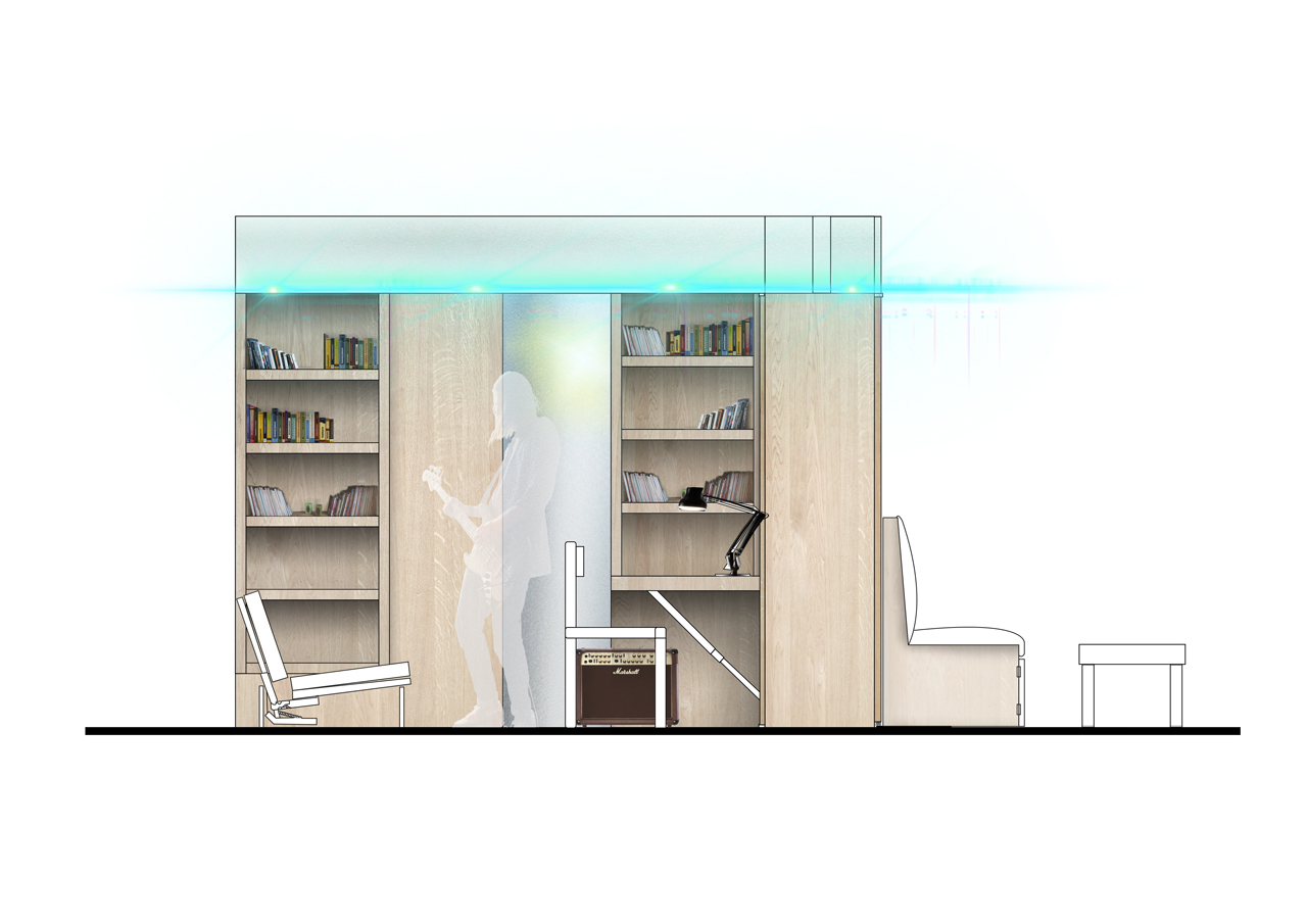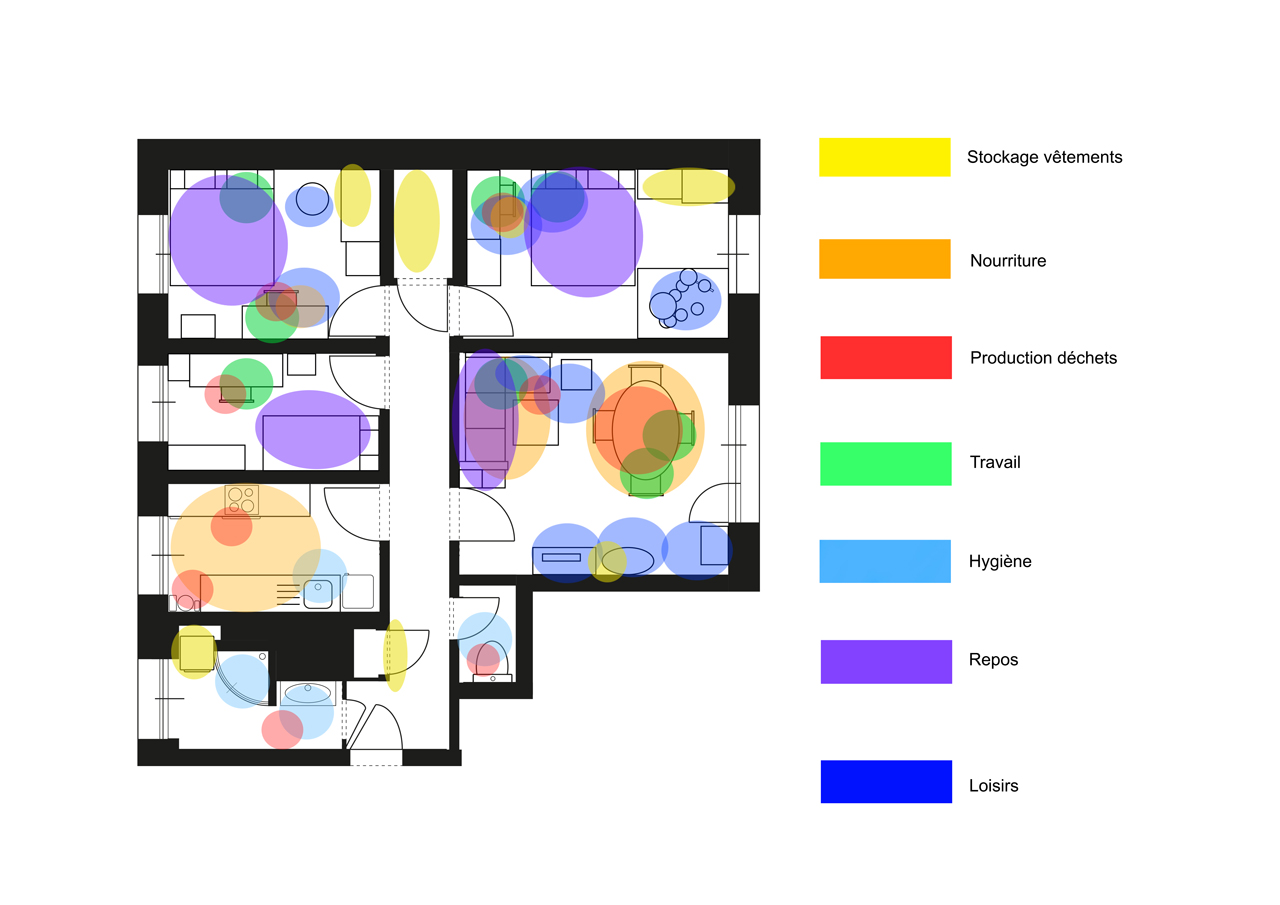 Repenser l’aménagement d’un espace privé. Ici, le but était d’enlever toutes les cloisons et de recréer des espaces de vie grâce à un mobilier structurant et adapté aux usages repérés au préalable. Dans le contexte d’une colocation à trois, dans un appartement aux multiples ouvertures, il a fallu trouver un compromis entre intimité et partage. Ces deux conditions ont été résolues grâce 2 meubles en L qui viennent créer quatre espaces clos, trois chambre et une salle de bain. Le reste de l’espace est donc destiné aux activités communes où l’individualité peut toujours y trouver sa place grâce à un meuble de rangement en son centre, compartimentant les usages, mais en permettant une circulation libre et ininterrompue d’un espace à l’autre. Les espaces chambre bénéficient d’un éclairage personnalisable, permettant de communiquer ses humeurs aux autres habitants.