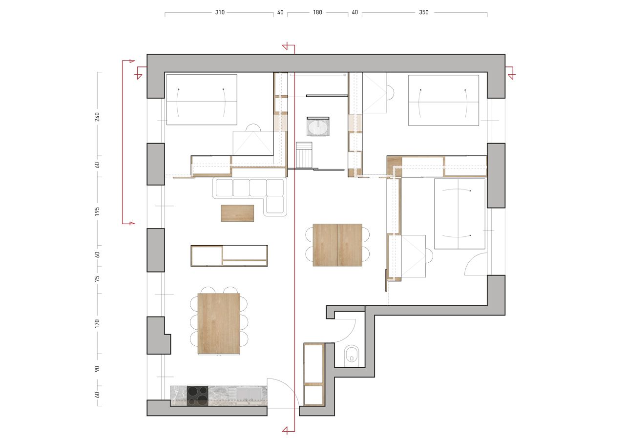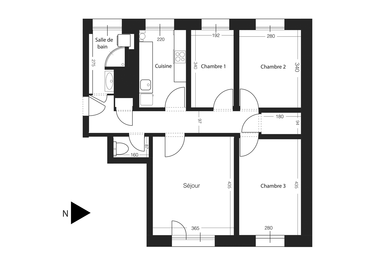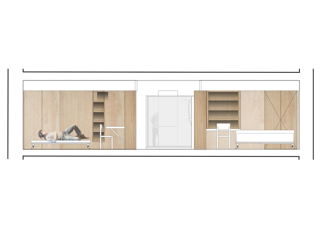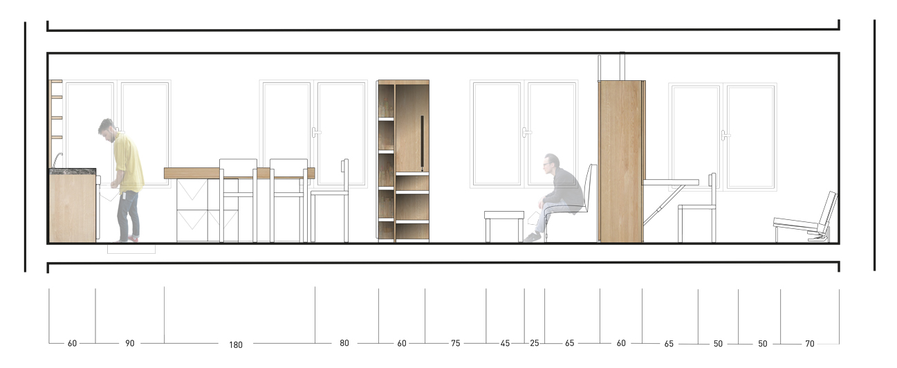 Repenser l’aménagement d’un espace privé. Ici, le but était d’enlever toutes les cloisons et de recréer des espaces de vie grâce à un mobilier structurant et adapté aux usages repérés au préalable. Dans le contexte d’une colocation à trois, dans un appartement aux multiples ouvertures, il a fallu trouver un compromis entre intimité et partage. Ces deux conditions ont été résolues grâce 2 meubles en L qui viennent créer quatre espaces clos, trois chambre et une salle de bain. Le reste de l’espace est donc destiné aux activités communes où l’individualité peut toujours y trouver sa place grâce à un meuble de rangement en son centre, compartimentant les usages, mais en permettant une circulation libre et ininterrompue d’un espace à l’autre. Les espaces chambre bénéficient d’un éclairage personnalisable, permettant de communiquer ses humeurs aux autres habitants.