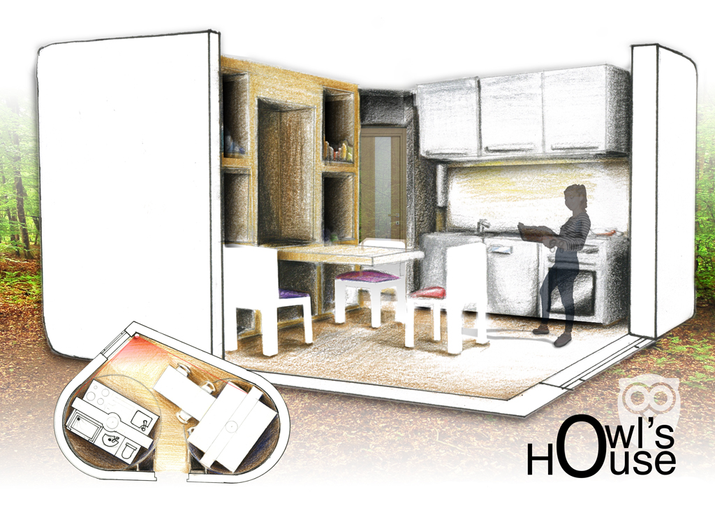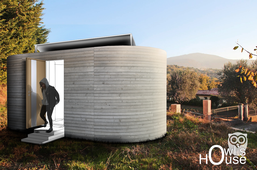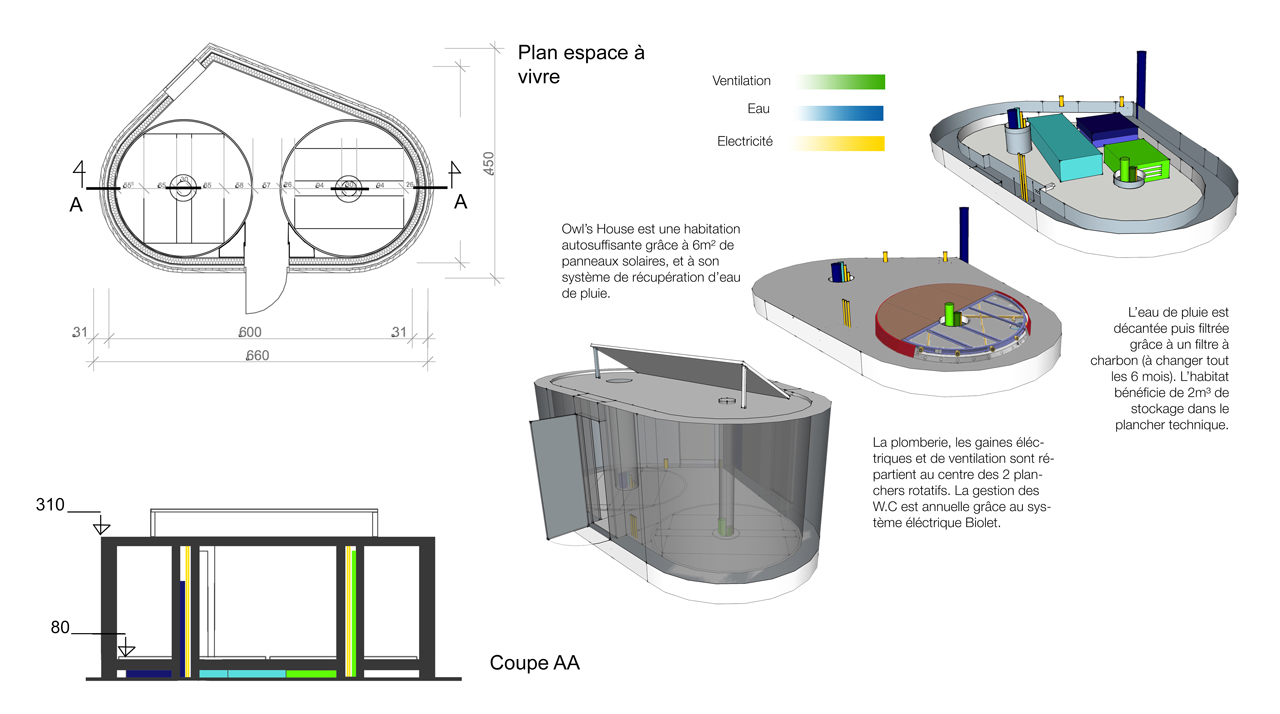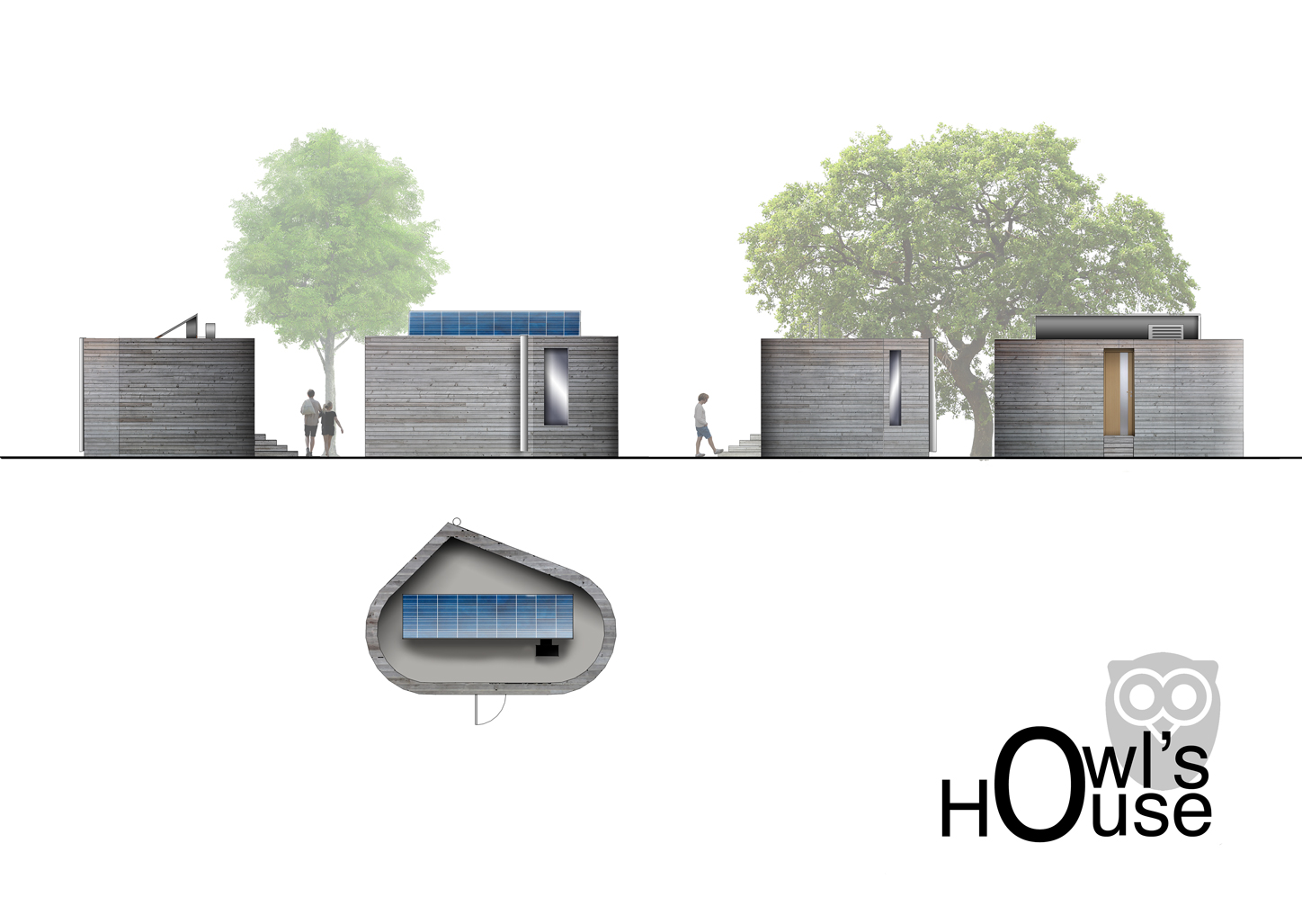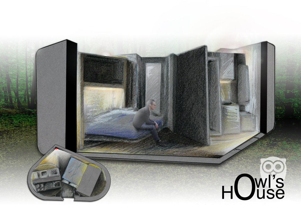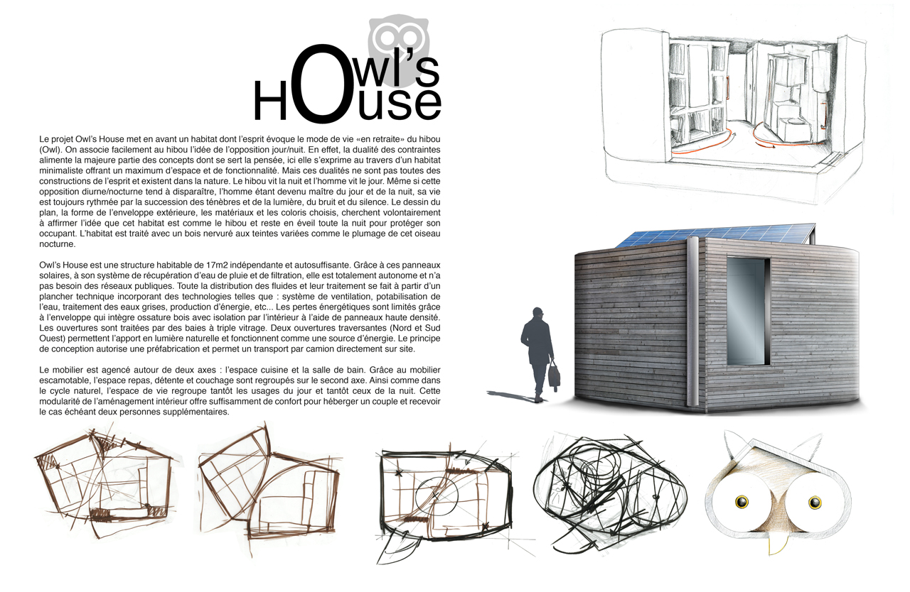 Le projet Owl’s House met en avant un habitat dont l’esprit évoque le mode de vie «en retraite» du hibou (Owl). On associe facilement au hibou l’idée de l’opposition jour/nuit. En effet, la dualité des contraintes alimente la majeure partie des concepts dont se sert la pensée, ici elle s’exprime au travers d’un habitat minimaliste offrant un maximum d’espace et de fonctionnalité. Mais ces dualités ne sont pas toutes des constructions de l’esprit et existent dans la nature. Le hibou vit la nuit et l’homme vit le jour. Même si cette opposition diurne/nocturne tend à disparaître, l’homme étant devenu maître du jour et de la nuit, sa vie est toujours rythmée par la succession des ténèbres et de la lumière, du bruit et du silence. Le dessin du plan, la forme de l’enveloppe extérieure, les matériaux et les coloris choisis, cherchent volontairement à affirmer l’idée que cet habitat est comme le hibou et reste en éveil toute la nuit pour protéger son occupant. L’habitat est traité avec un bois nervuré aux teintes variées comme le plumage de cet oiseau nocturne.