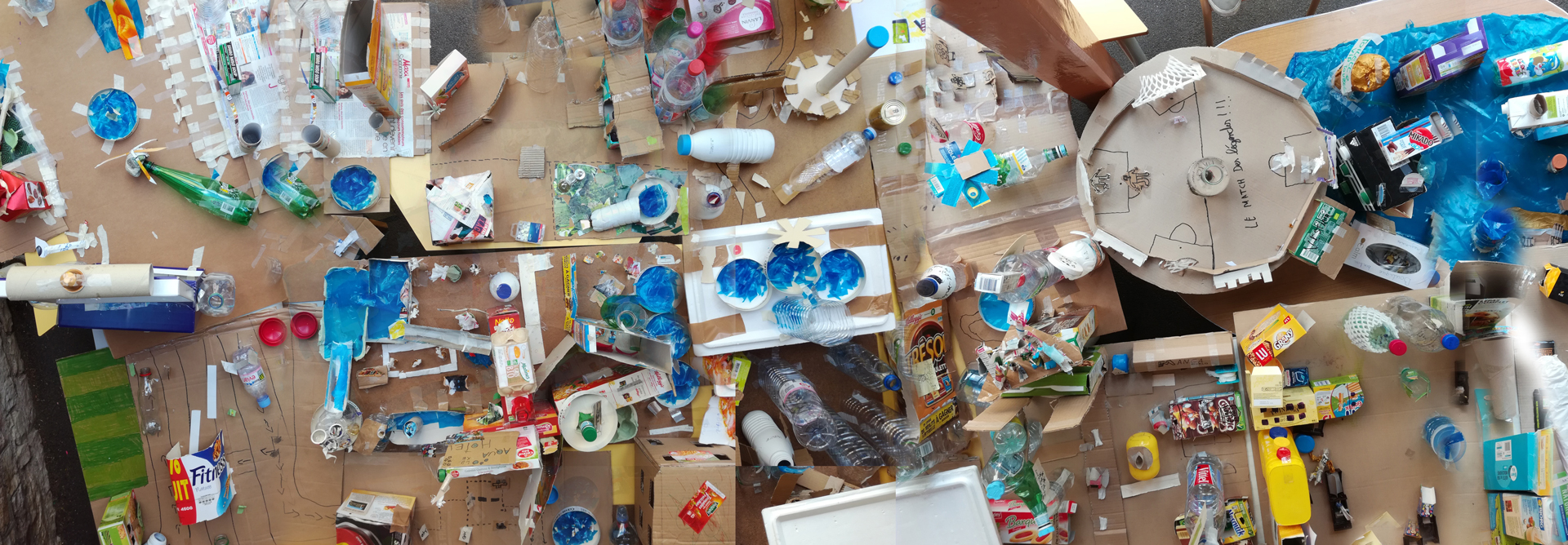 Après notre première rencontre, nous avons décidé de concevoir une maquette de ville utopique, en utilisant les méthodes de projet, simplifiées. Chacun à ramené des matériaux recyclables issu de leur consommation personnelle (boites de céréales, bouteilles en plastiques ...). Nous avons voulu créer une cohérence esthétique pour évoquer les habitudes de consommation.