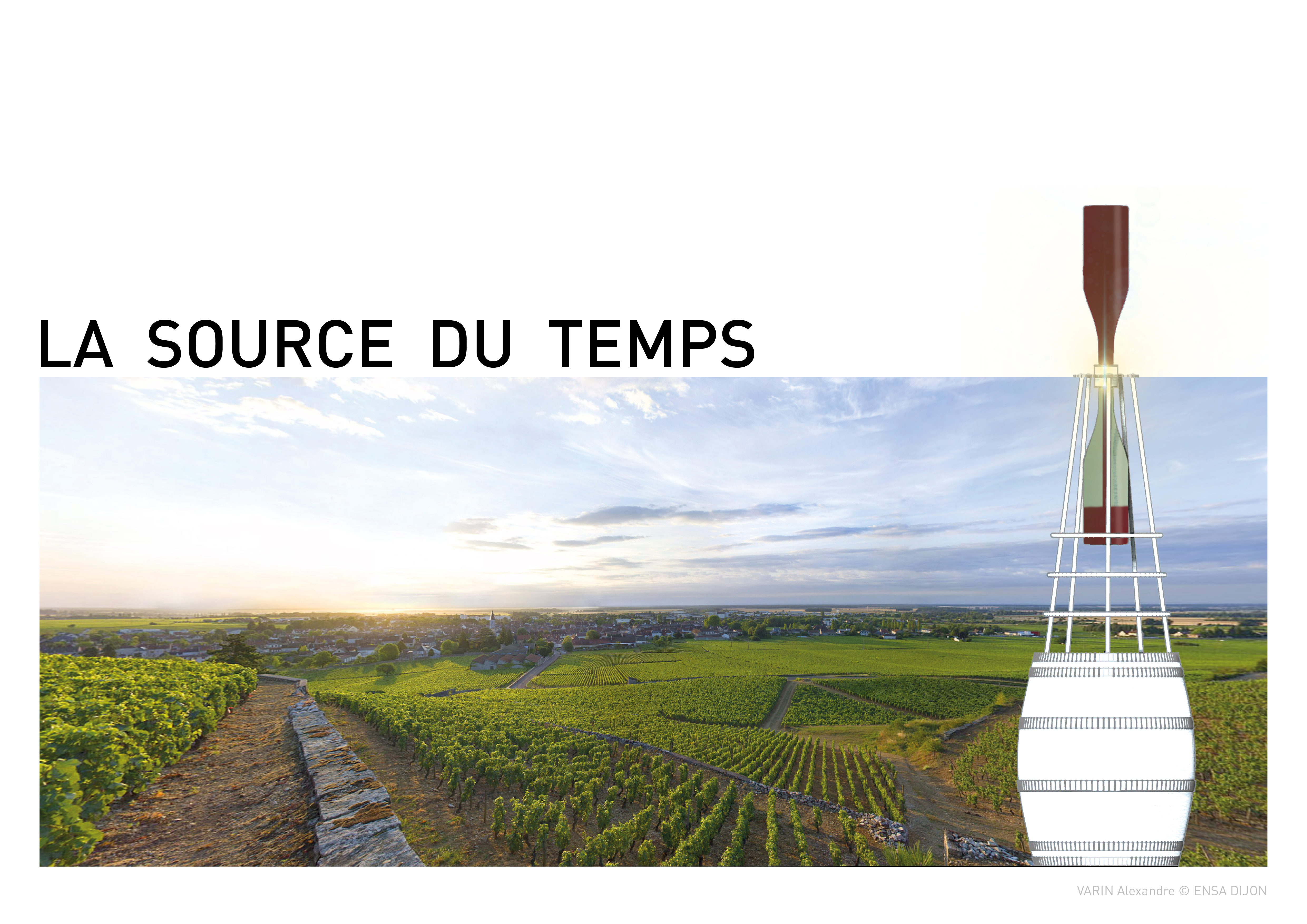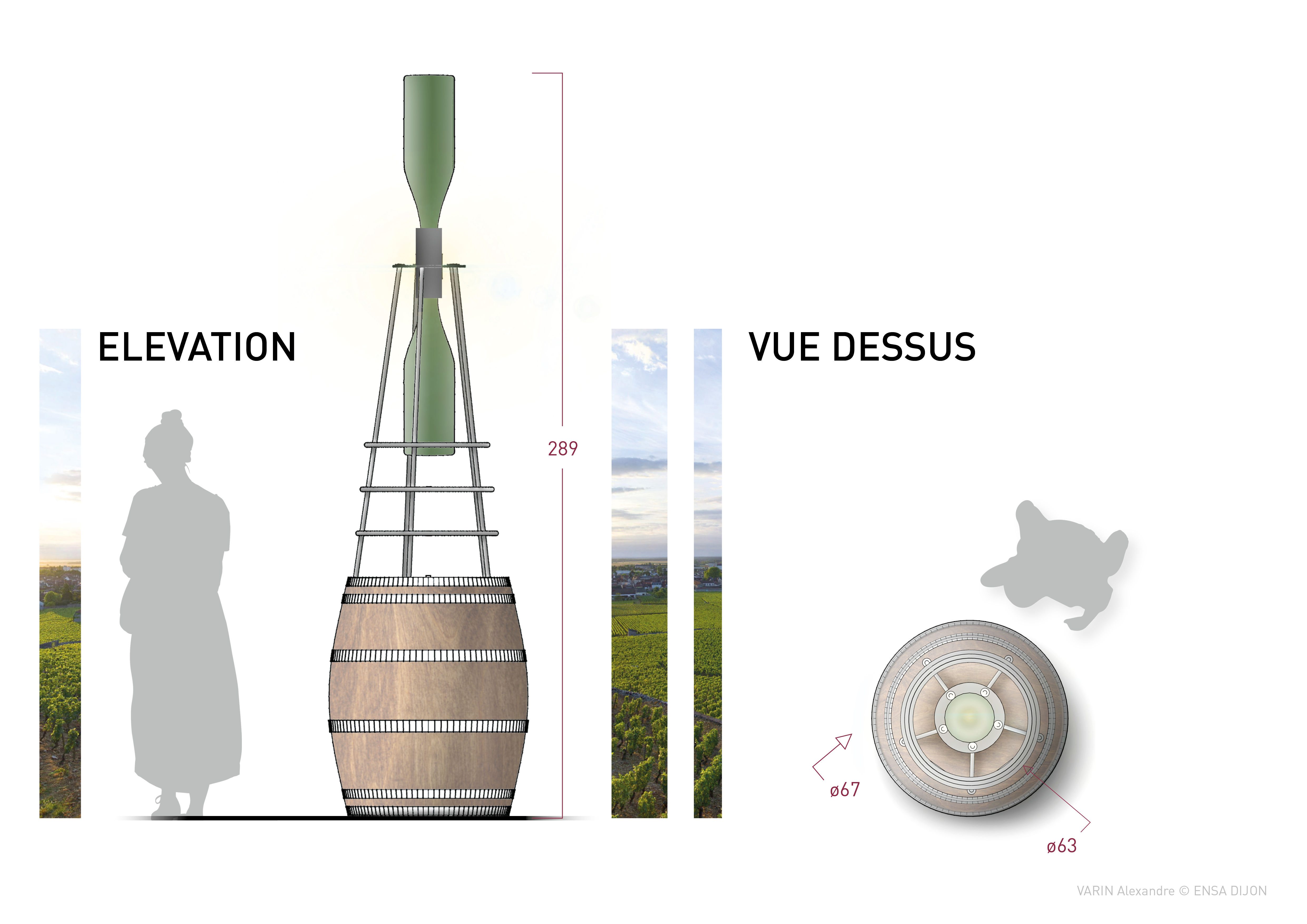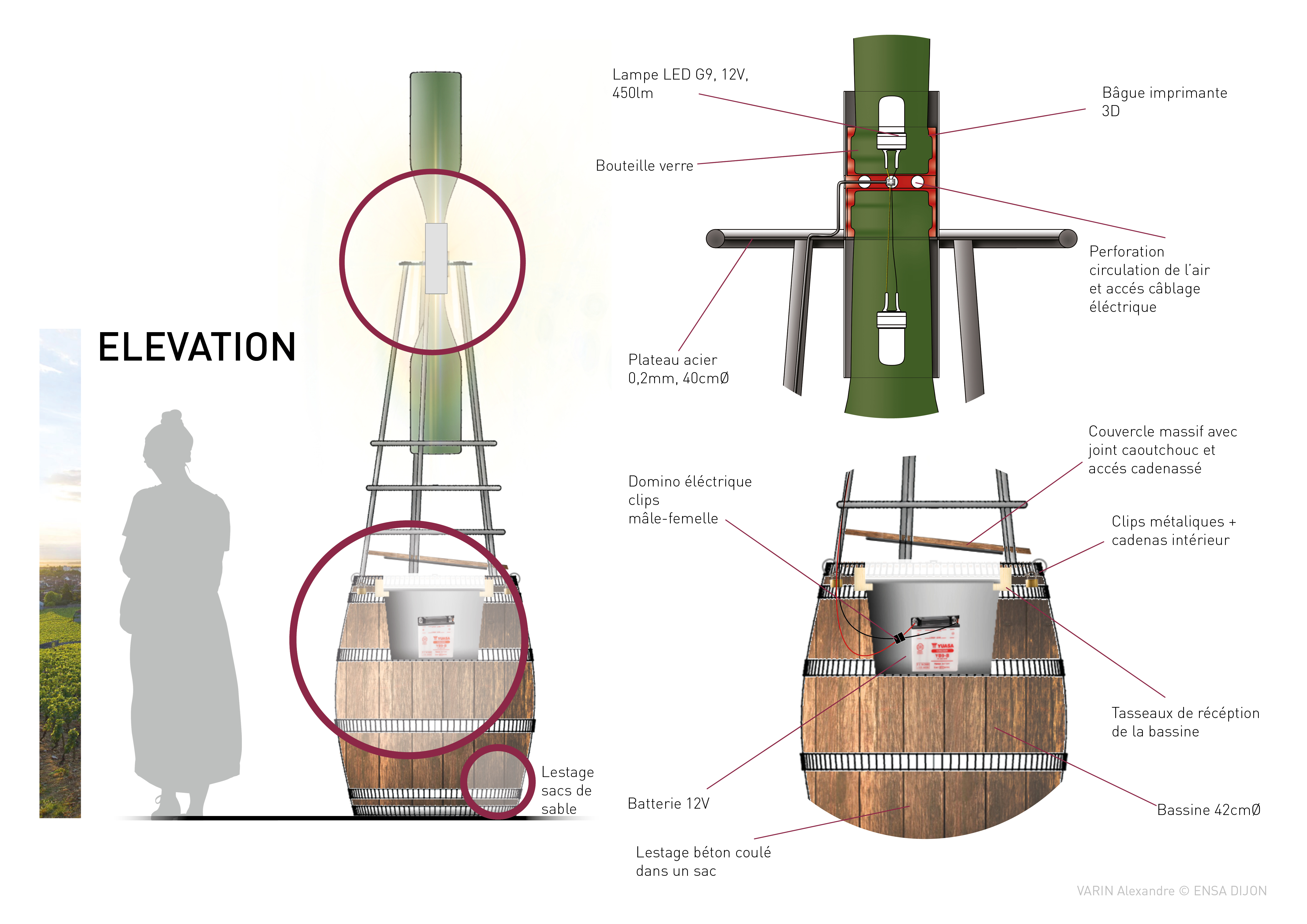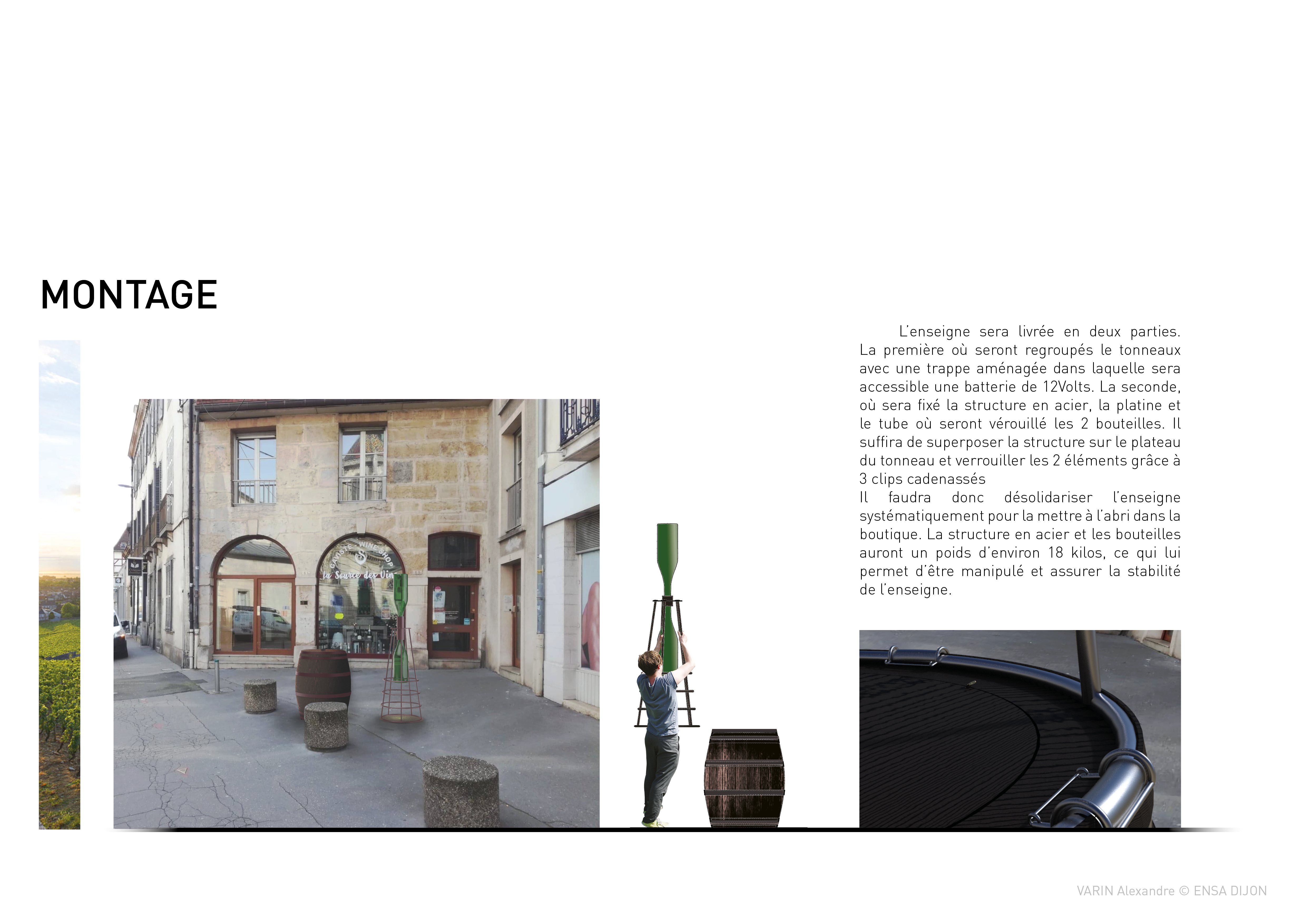 Originally, she meticulously arranged a composition of antique objects and samples from her store on a barrel worn by the time. With the idea of a signal object, I imagined a structure inspired by maritime beacons, supporting two Balthazar bottles (12L). These large capacity bottles are arranged according to a device for dynamizing the water, a process used in some Burgundian estates, evoking the shape of an hourglass. This reference to time evokes one of the essential ingredients in the elaboration of great wines: time. This luminous sign, organized on a metal structure, is removable and can be positioned during the day on the existing barrel. This project is being validated by the municipal services of the city of Dijon.