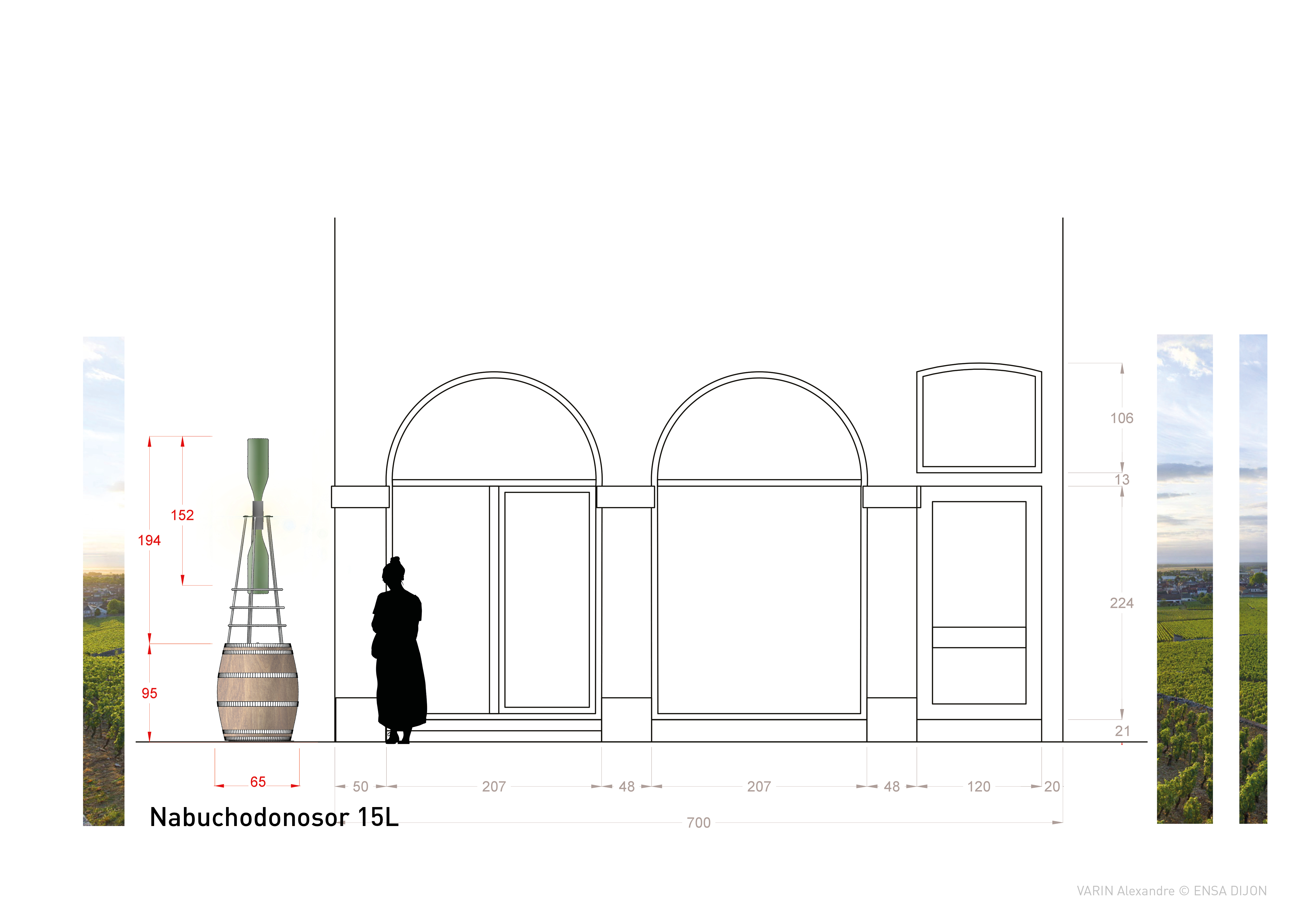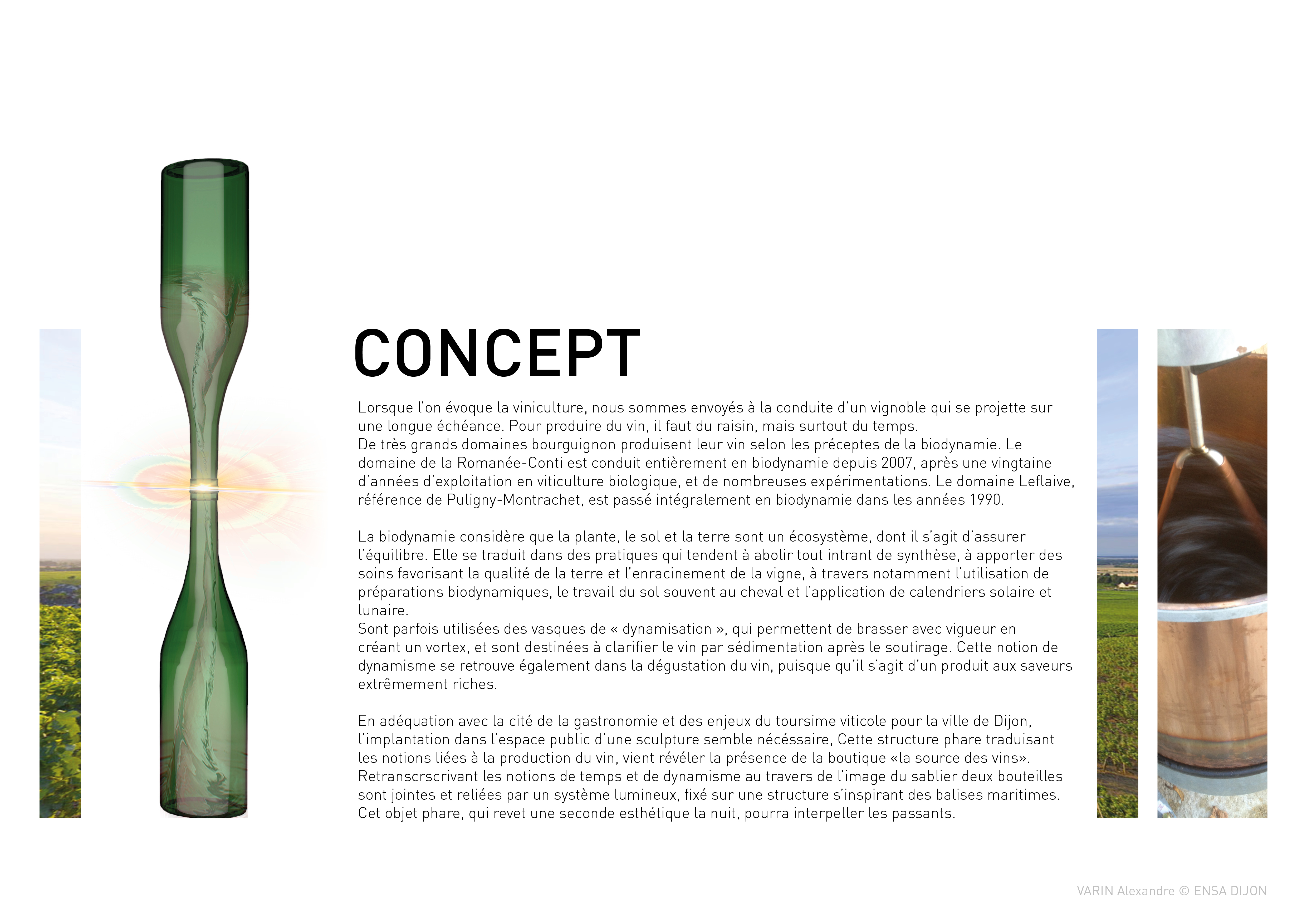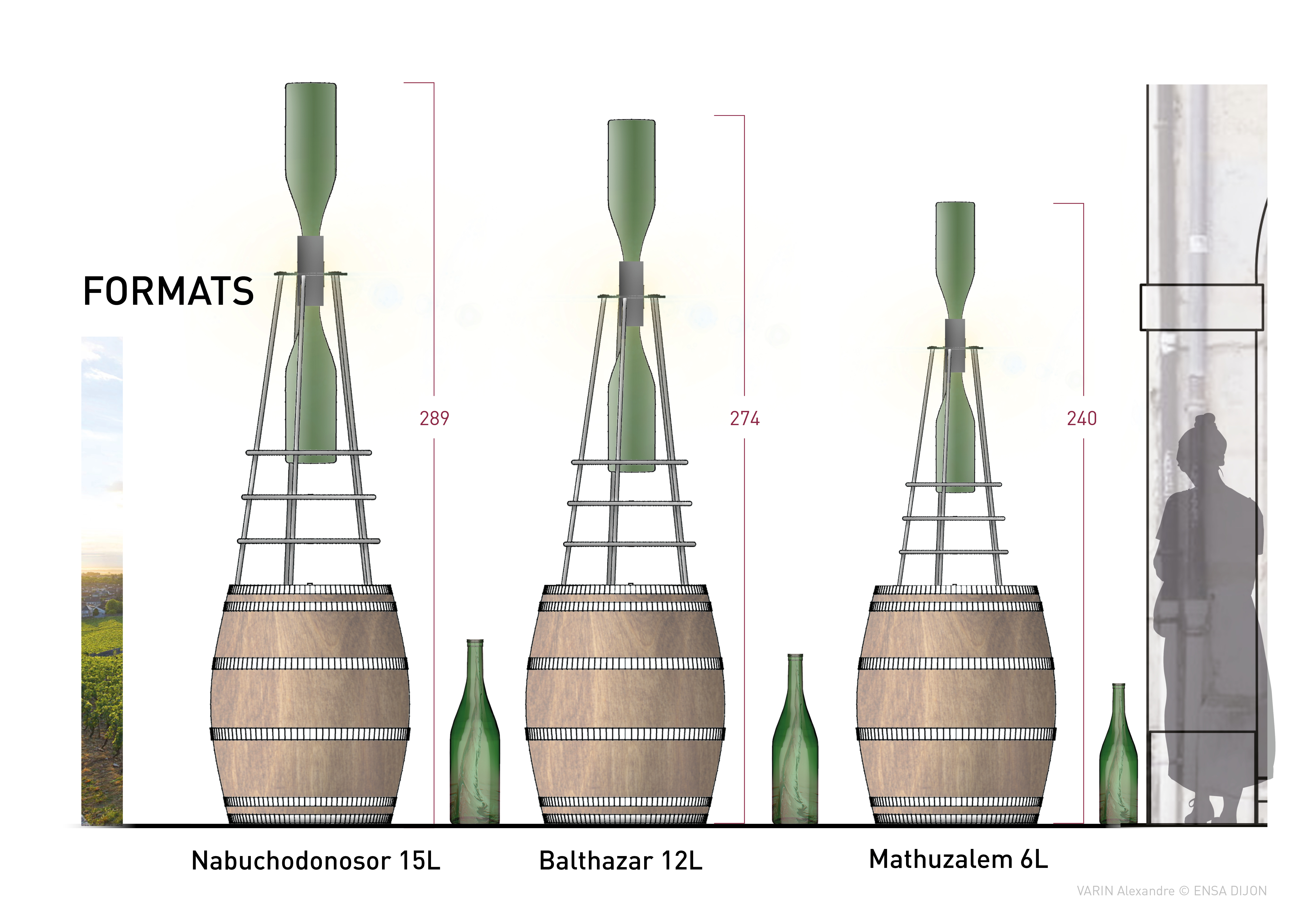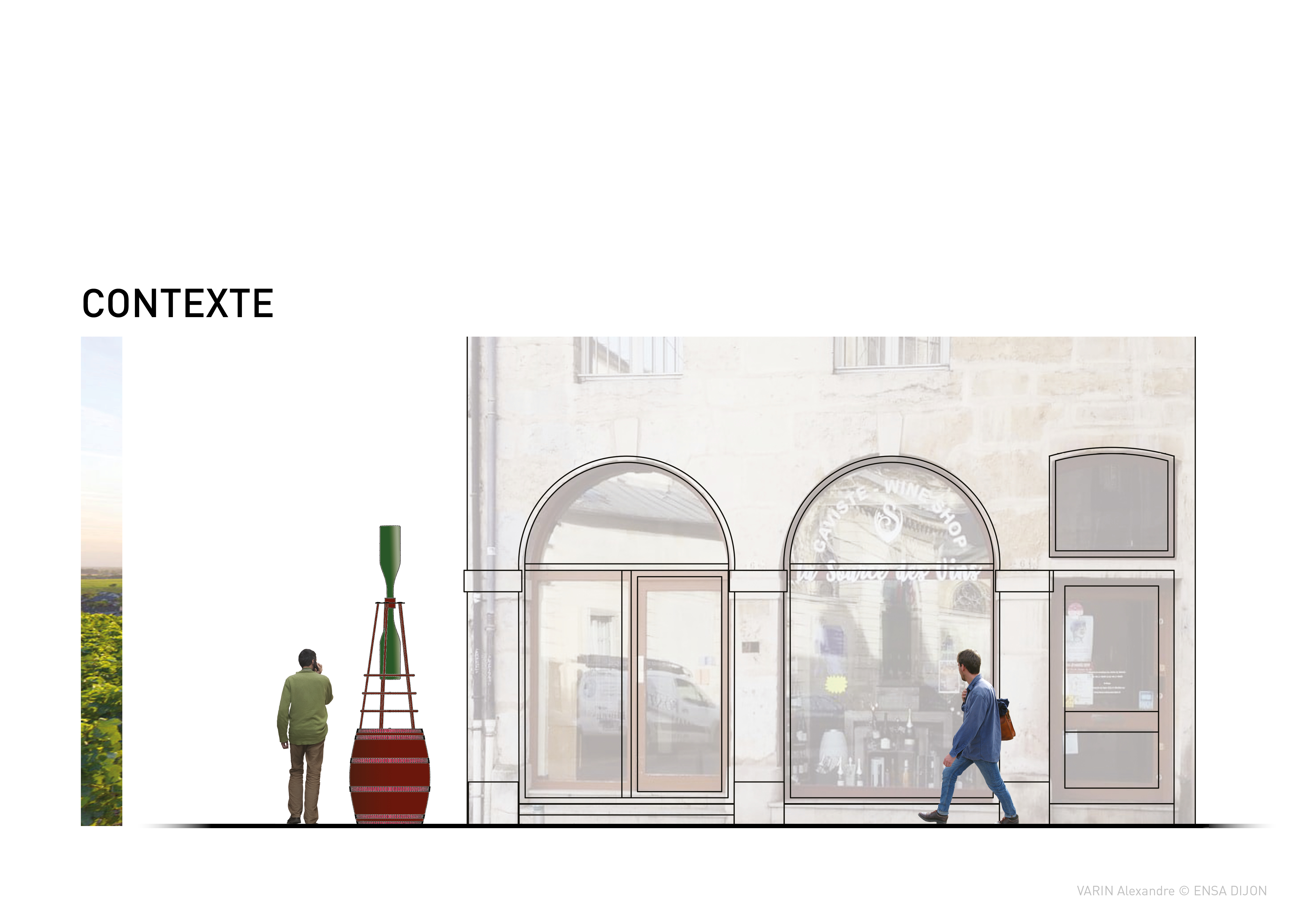 Originally, she meticulously arranged a composition of antique objects and samples from her store on a barrel worn by the time. With the idea of a signal object, I imagined a structure inspired by maritime beacons, supporting two Balthazar bottles (12L). These large capacity bottles are arranged according to a device for dynamizing the water, a process used in some Burgundian estates, evoking the shape of an hourglass. This reference to time evokes one of the essential ingredients in the elaboration of great wines: time. This luminous sign, organized on a metal structure, is removable and can be positioned during the day on the existing barrel. This project is being validated by the municipal services of the city of Dijon.